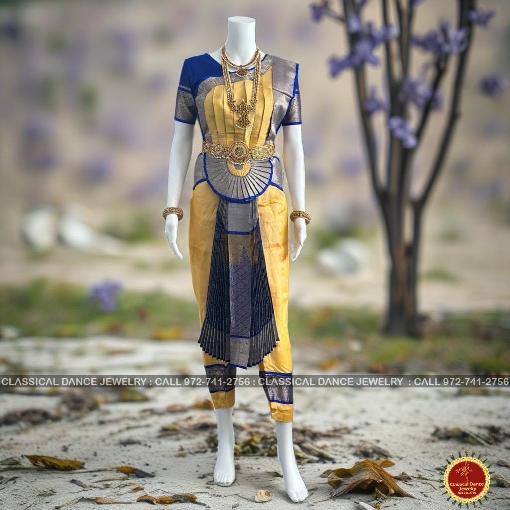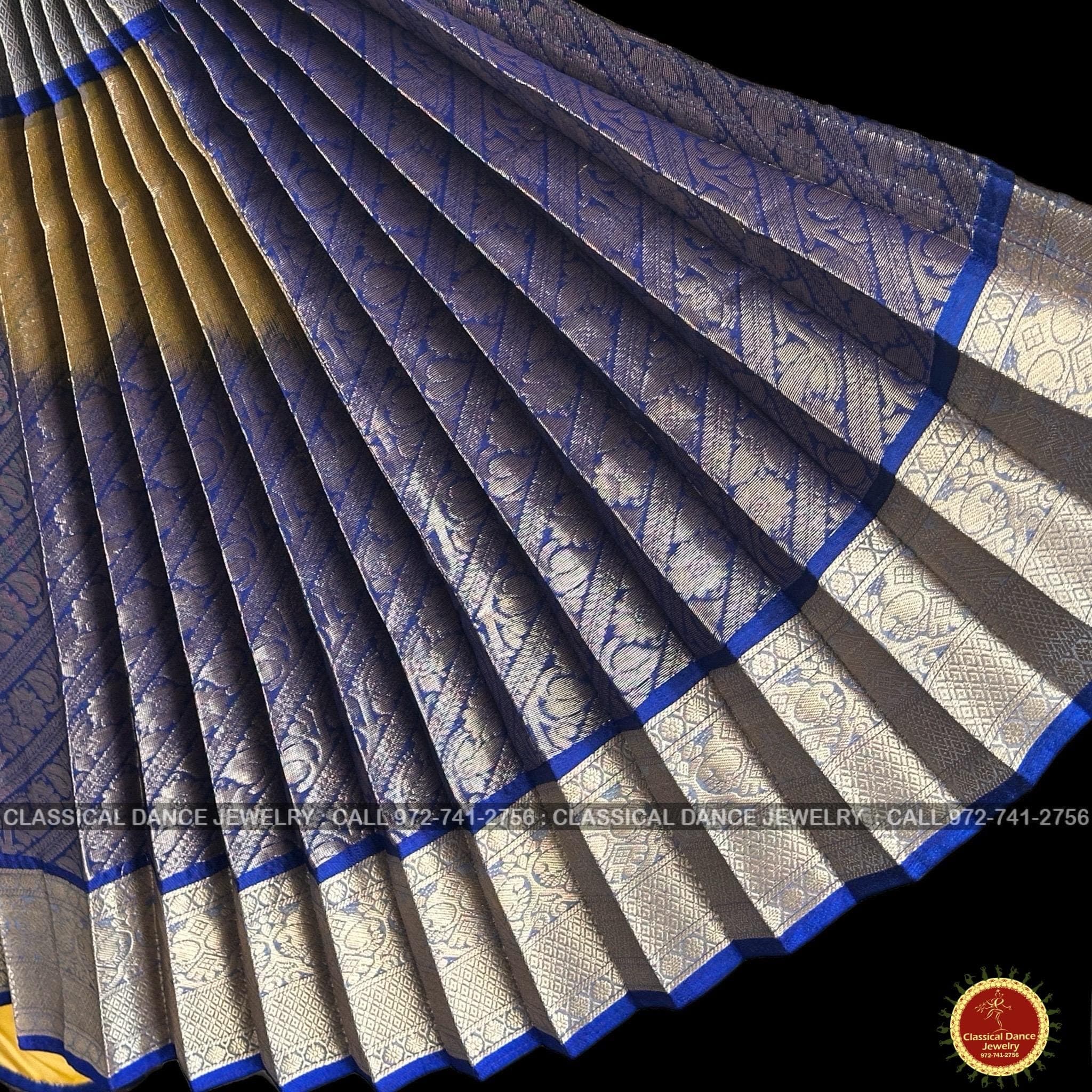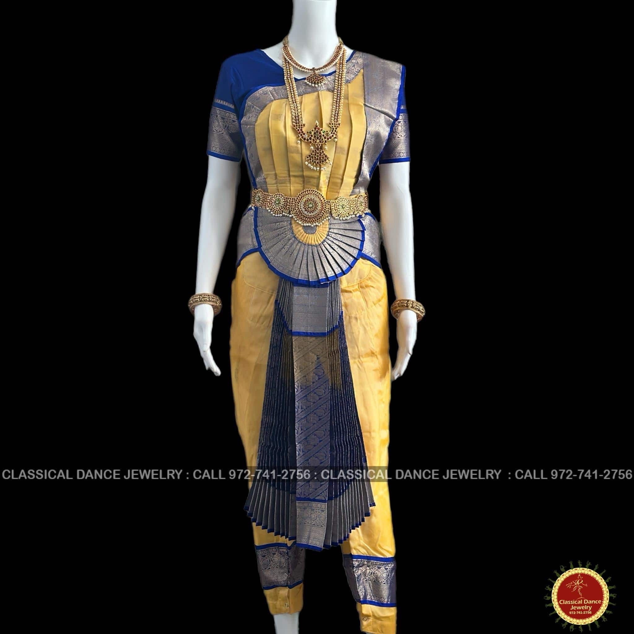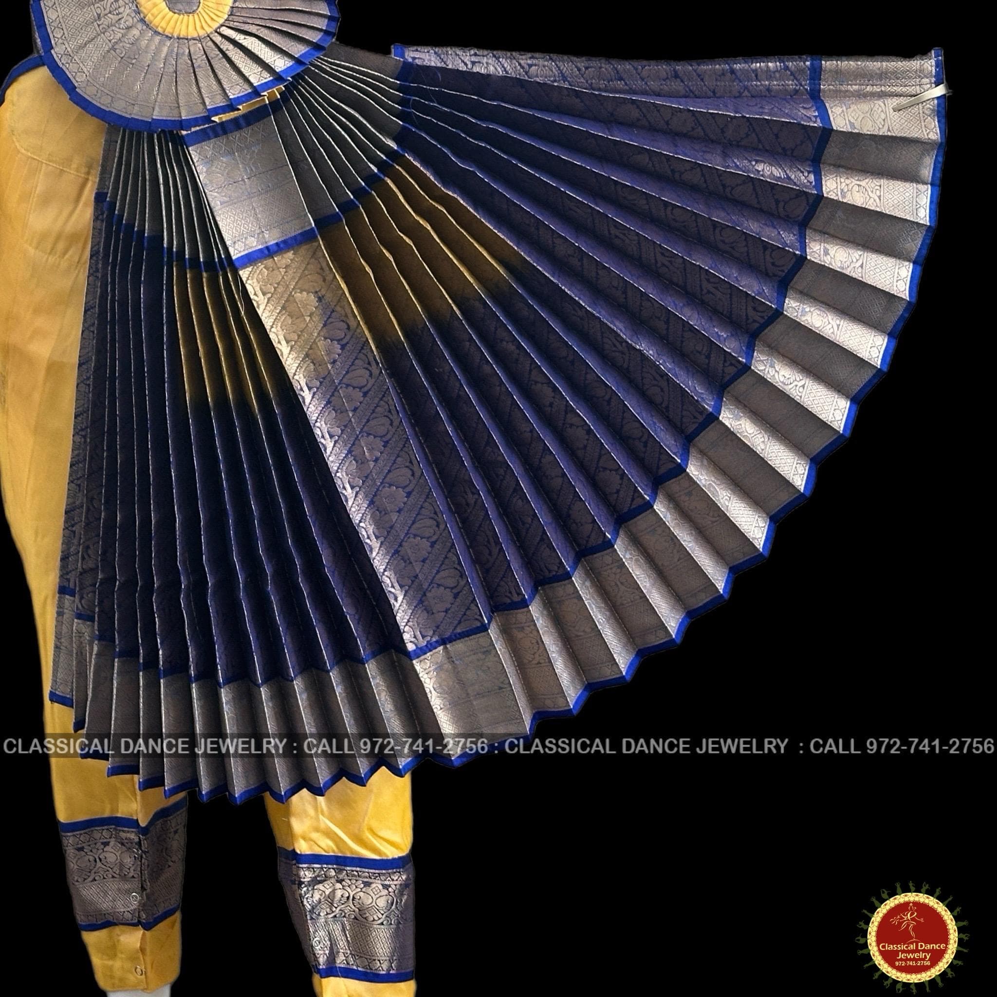 BUTTER YELLOW Dark BLUE 38 Inch Pant Length Bharatanatyam Dance Costume | Gold Zari | Art Silk Dharmavaram Kanchi | Classical Dance Jewelry