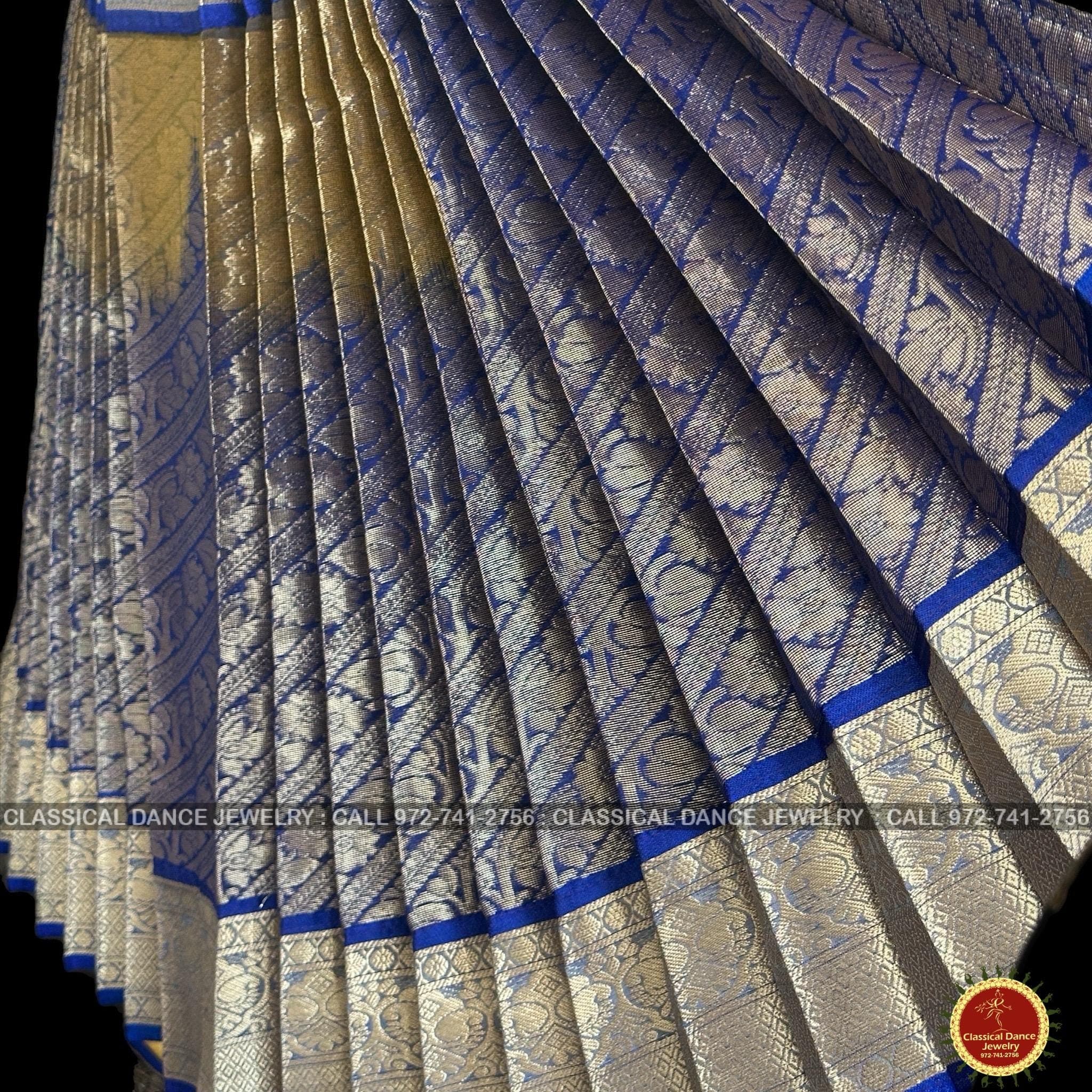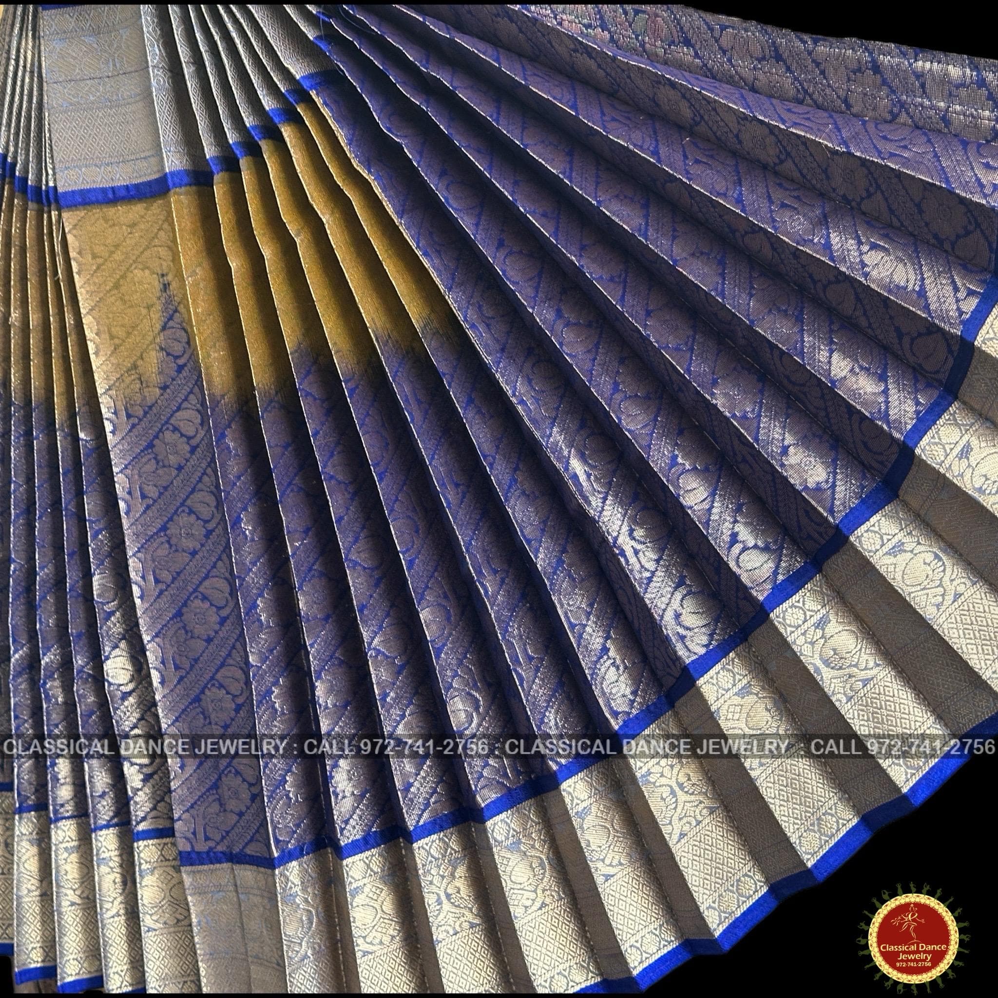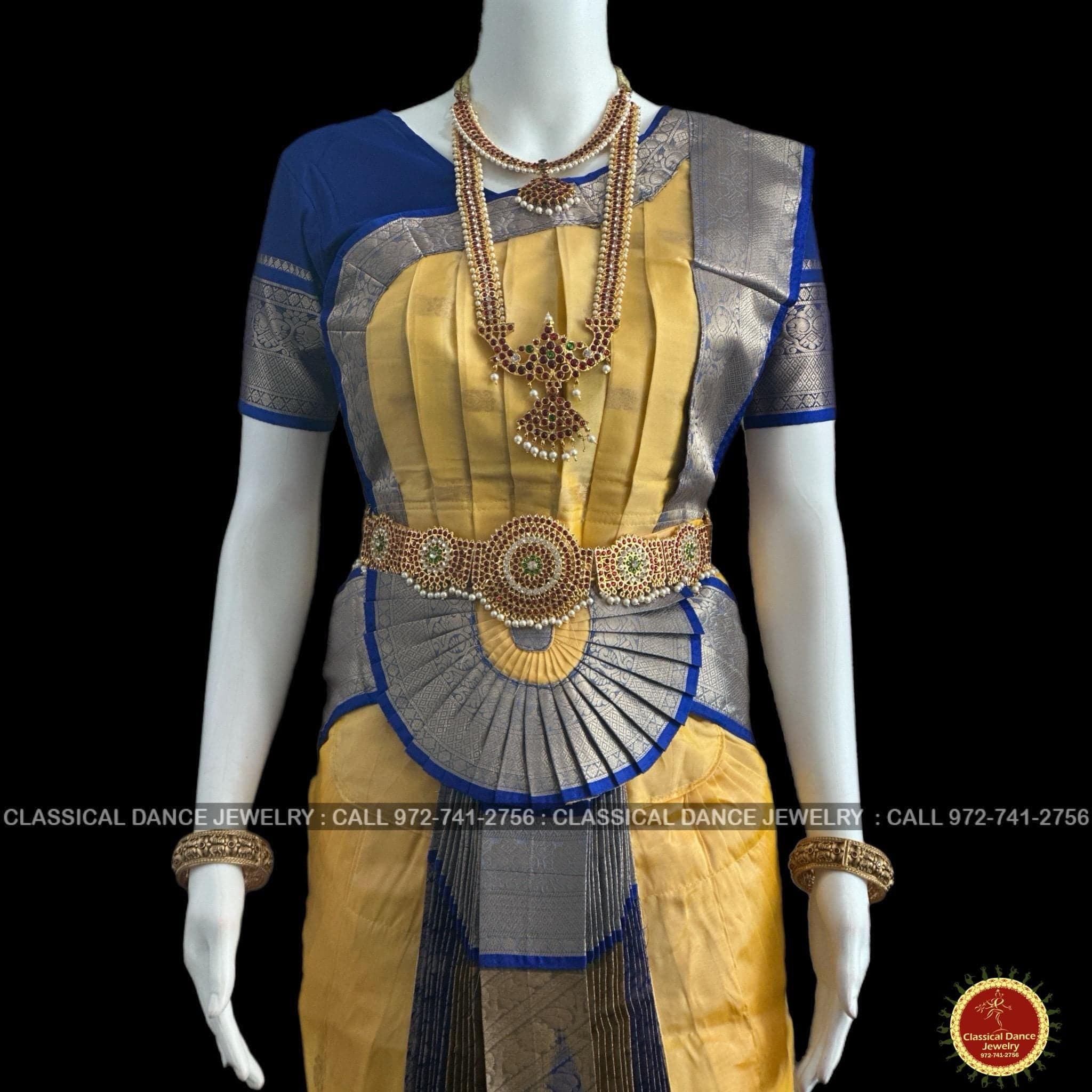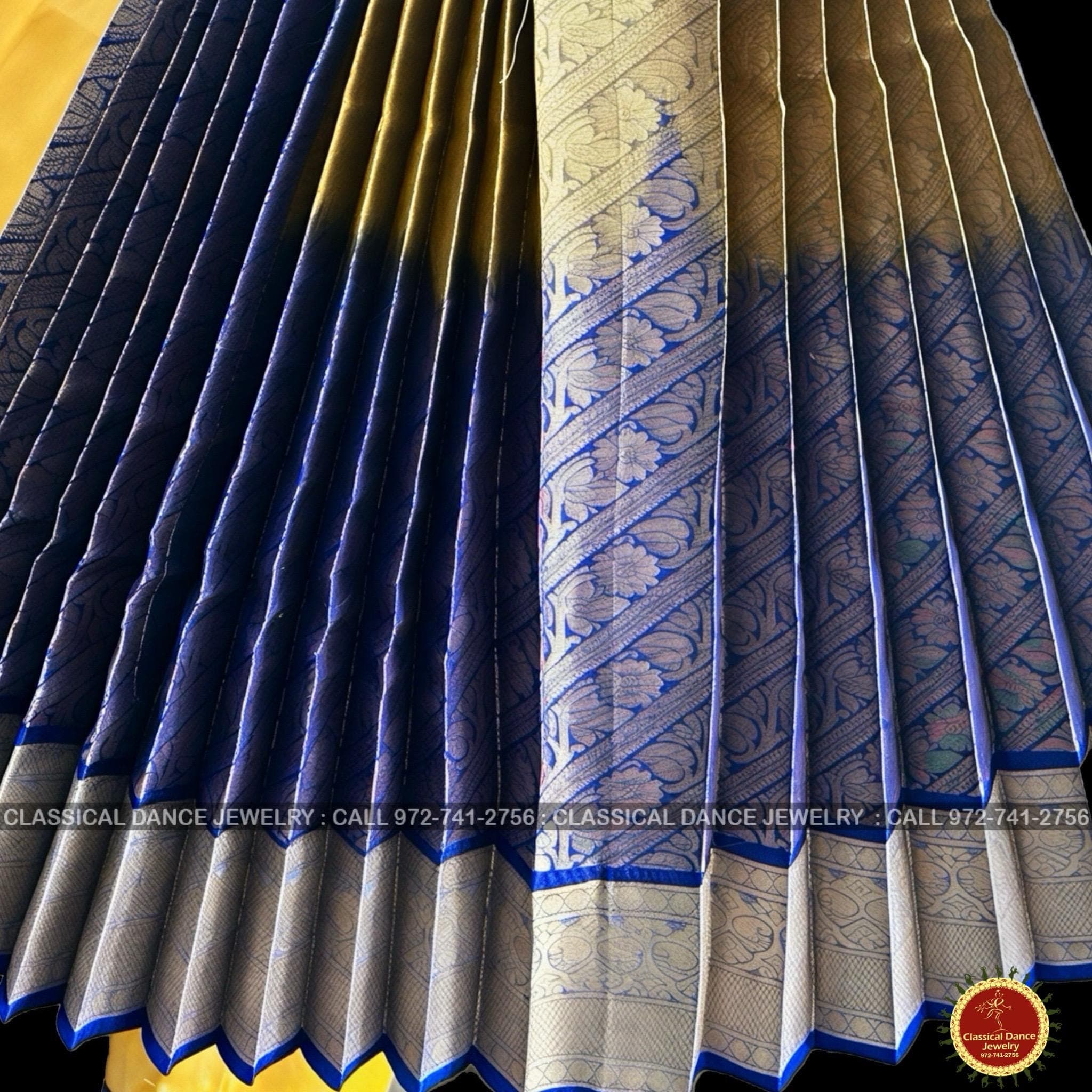BUTTER YELLOW Dark BLUE 38 Inch Pant Length Bharatanatyam Dance Costume | Gold Zari | Art Silk Dharmavaram Kanchi | Classical Dance Jewelry