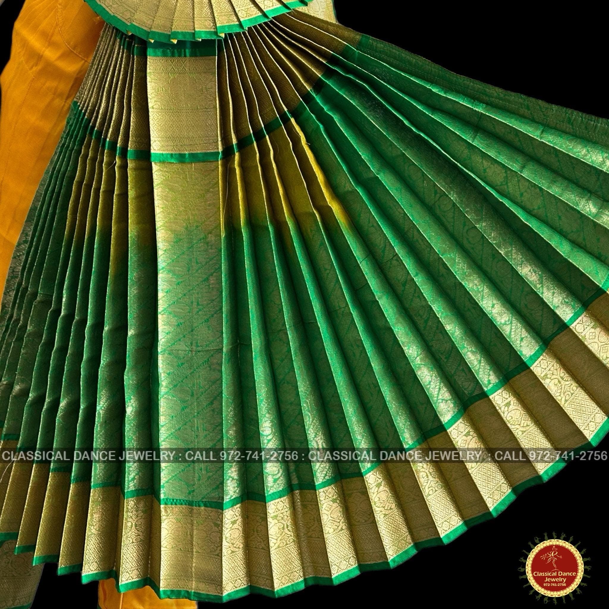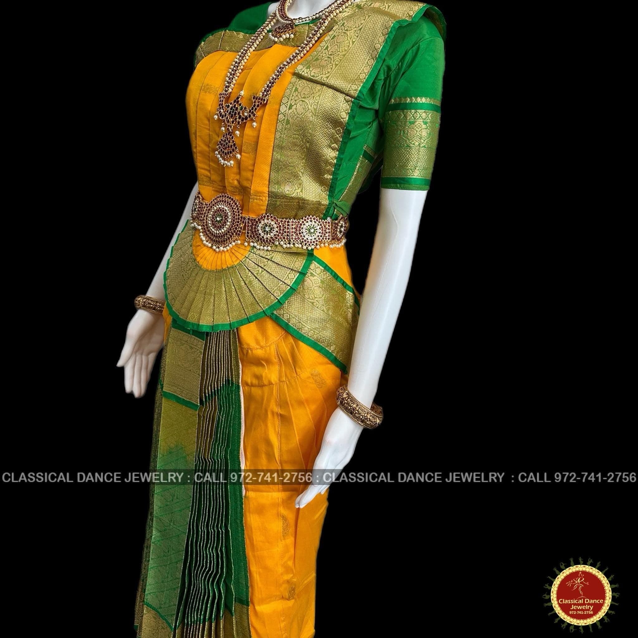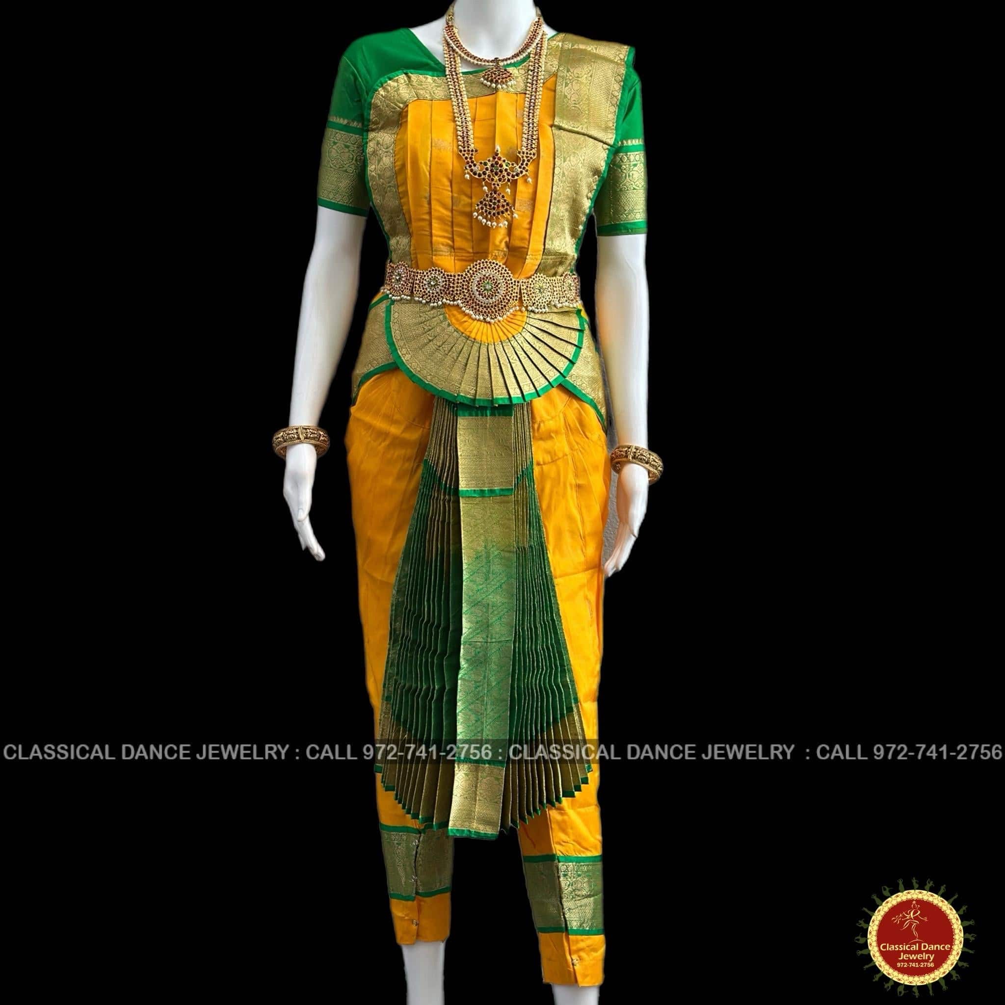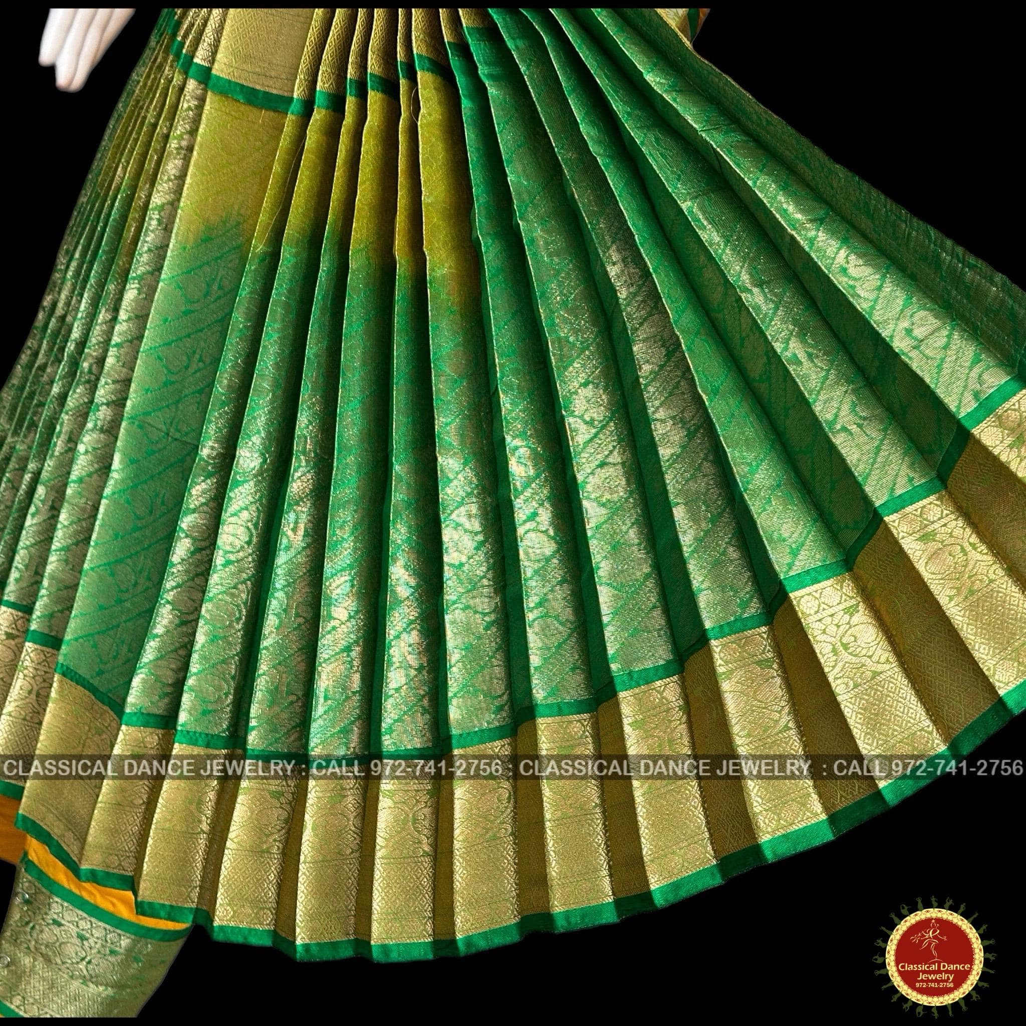 MANGO YELLOW GREEN 38 Inch Pant Length Bharatanatyam Dance Costume | Gold Zari | Art Silk Dharmavaram Kanchi | Classical Dance Jewelry