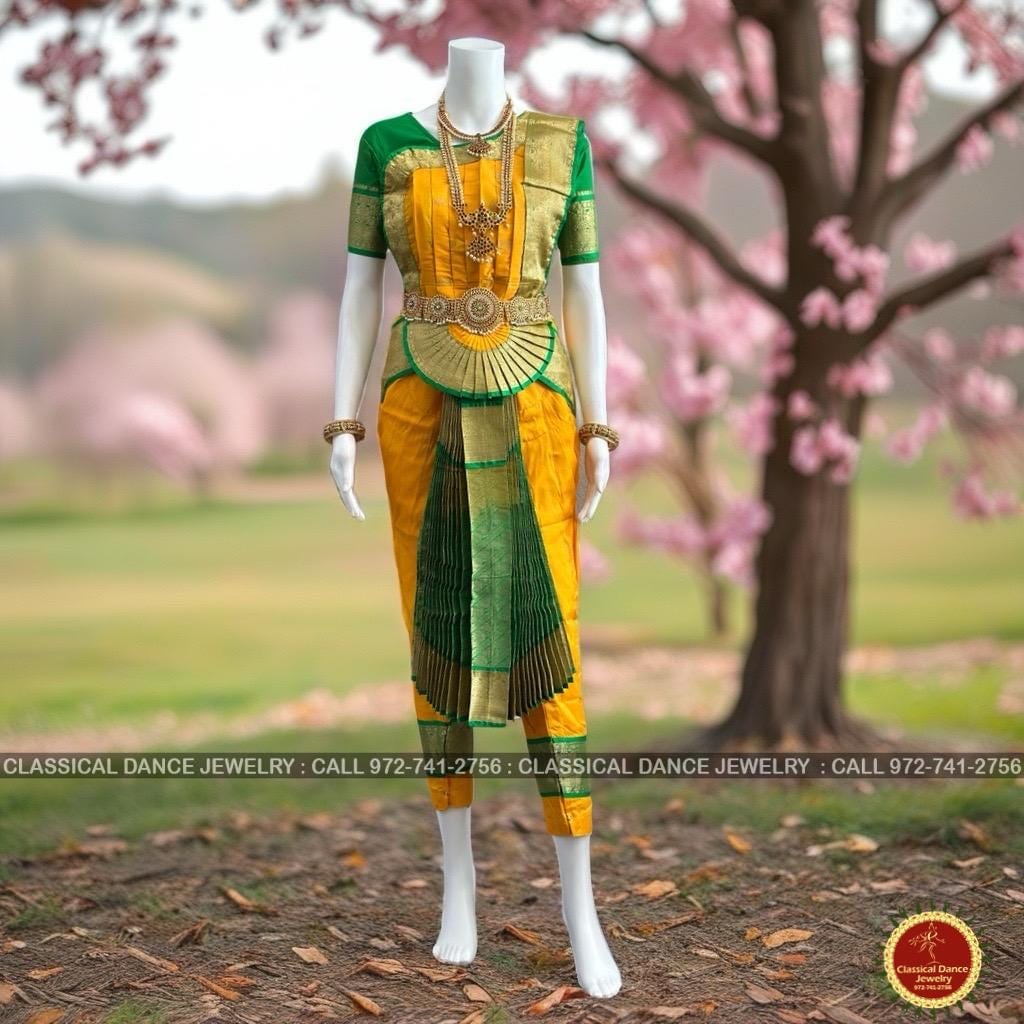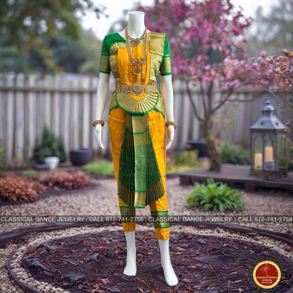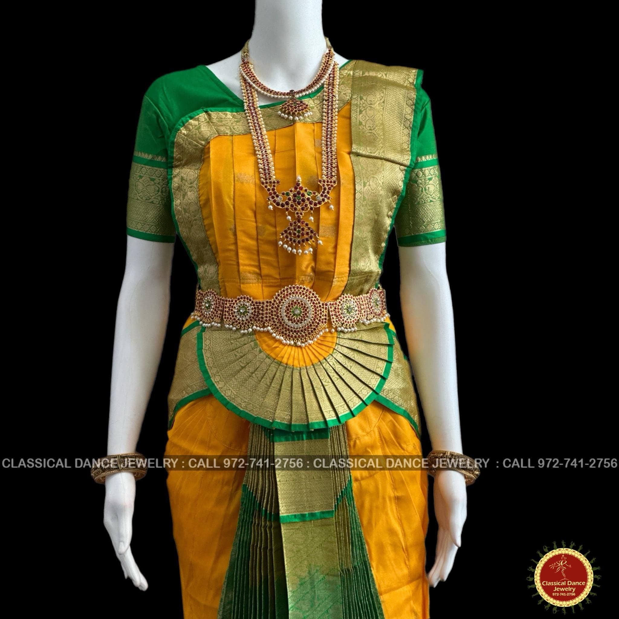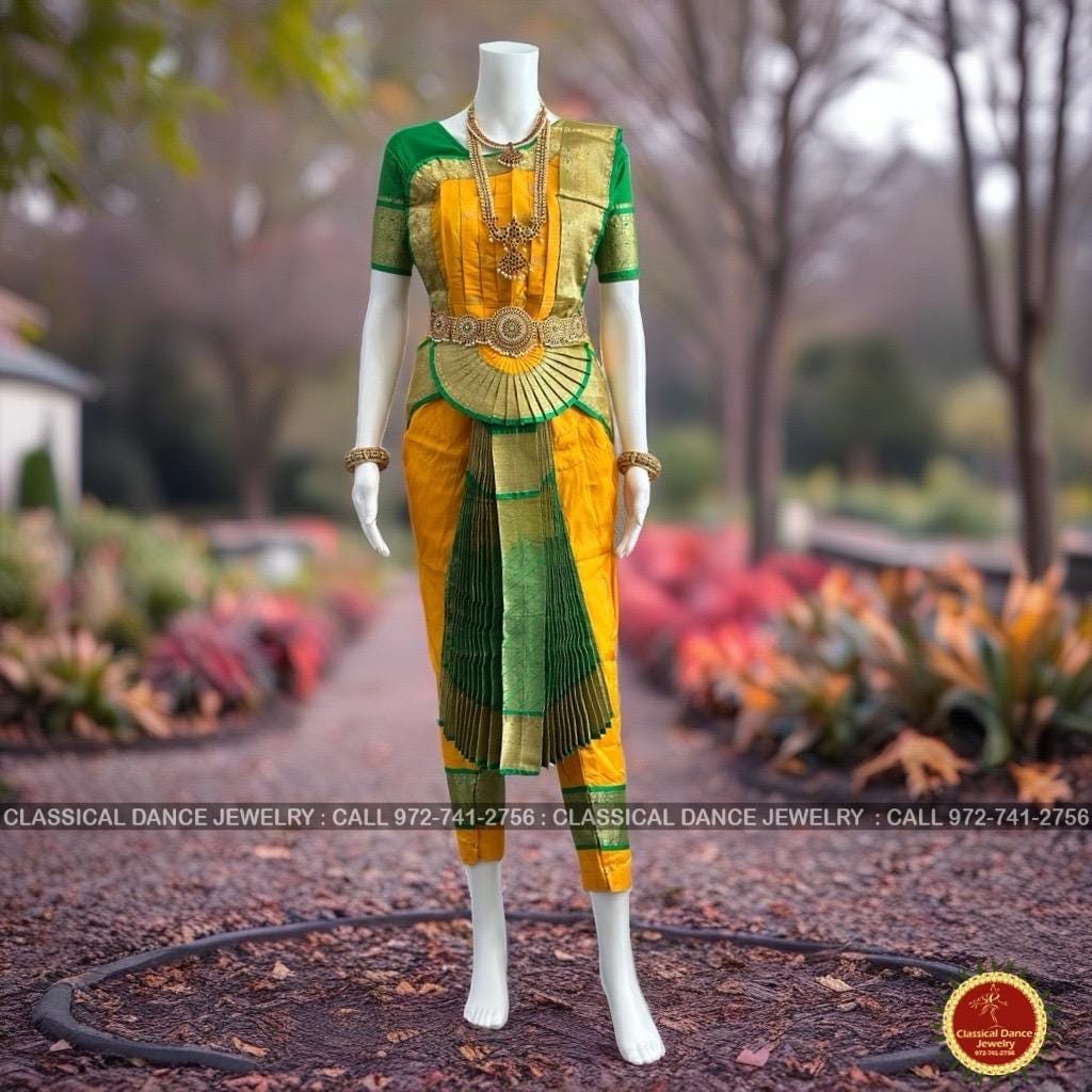 MANGO YELLOW GREEN 38 Inch Pant Length Bharatanatyam Dance Costume | Gold Zari | Art Silk Dharmavaram Kanchi | Classical Dance Jewelry