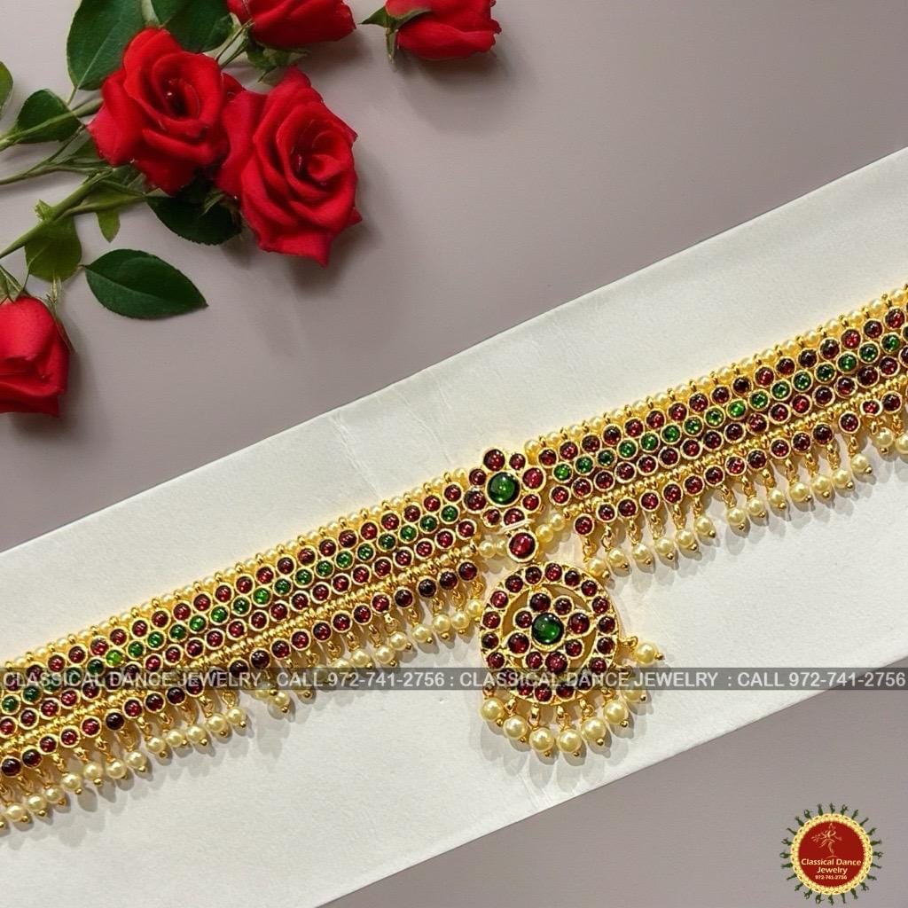 ❥ Gorgeous Temple Kemp Indian Jewelry with Kempu, Stones, Hip chain, Waist Belt, Oddiyanam Kamabandh for weddings, Bharatnatyam, and Kuchipudi Dance Performances.