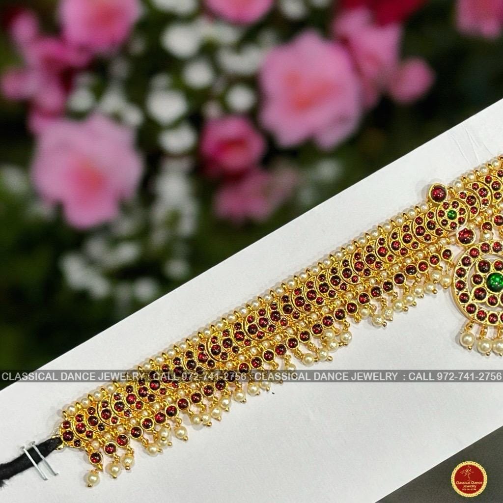 ❥ Gorgeous Temple Kemp Indian Jewelry with Kempu, Stones, Hip chain, Waist Belt, Oddiyanam Kamabandh for weddings, Bharatnatyam, and Kuchipudi Dance Performances.