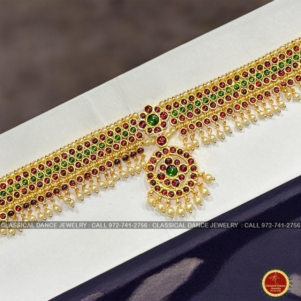 ❥ Gorgeous Temple Kemp Indian Jewelry with Kempu, Stones, Hip chain, Waist Belt, Oddiyanam Kamabandh for weddings, Bharatnatyam, and Kuchipudi Dance Performances.