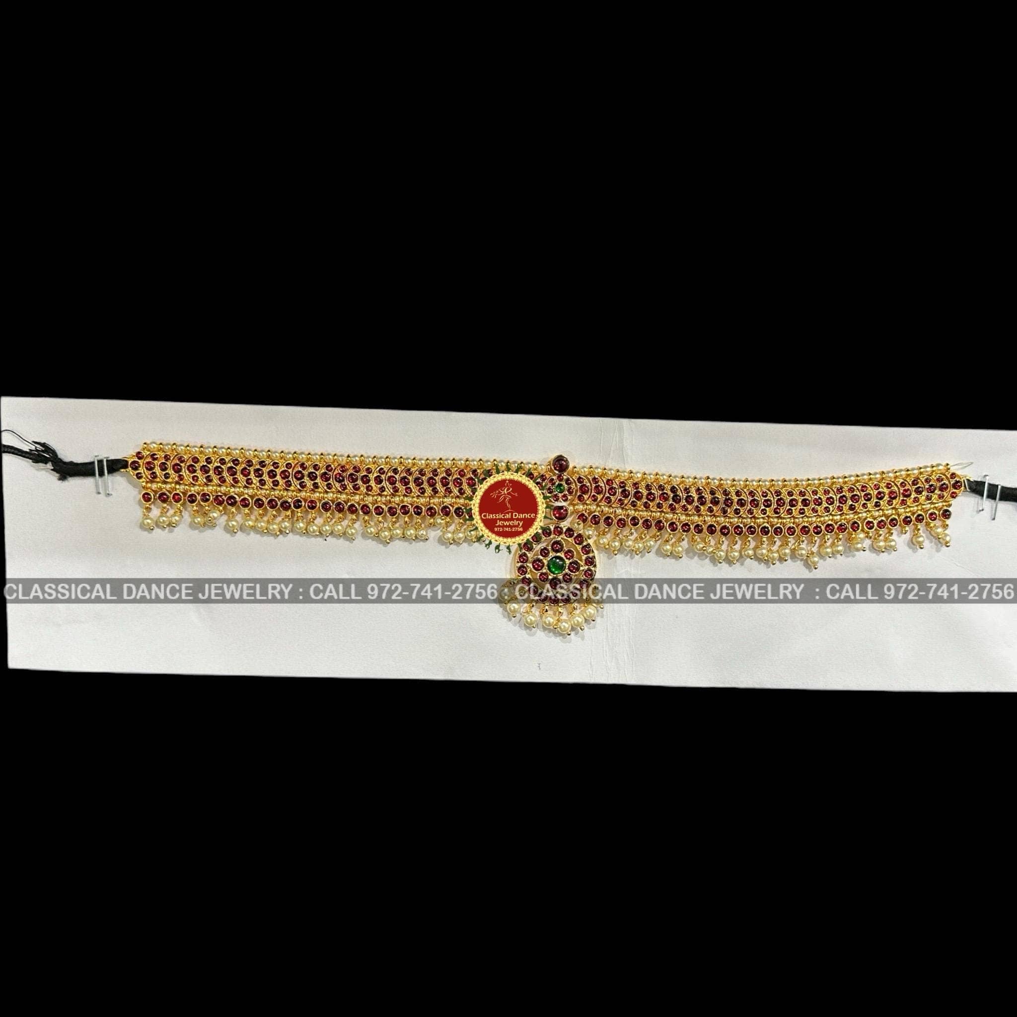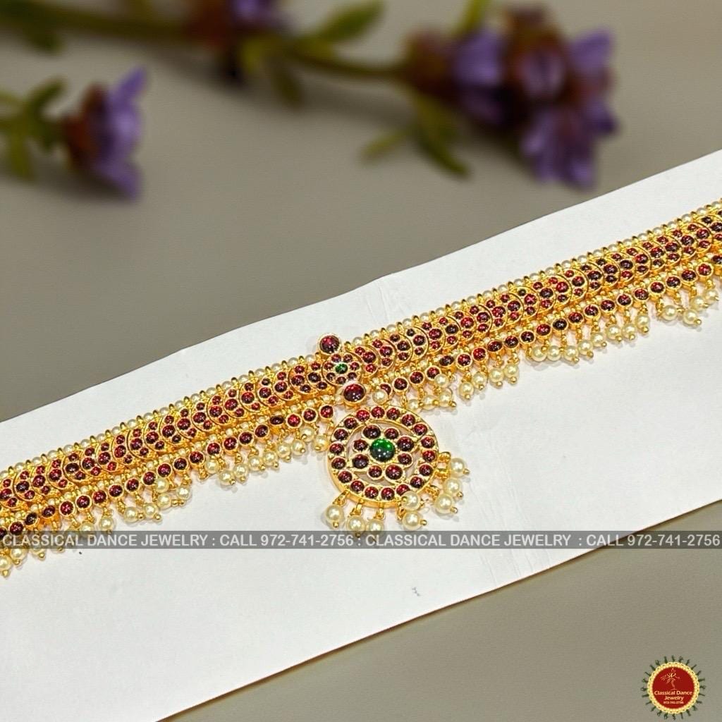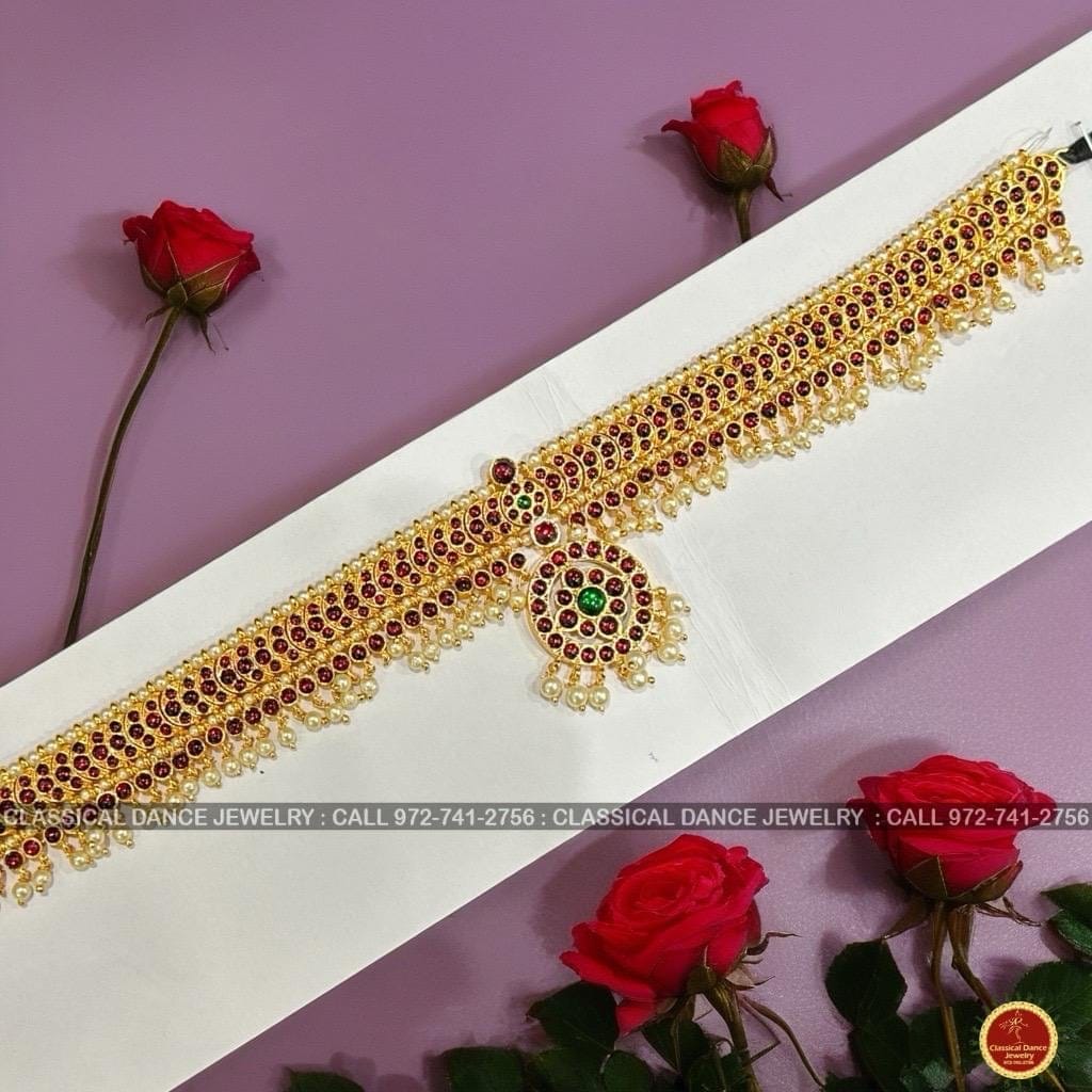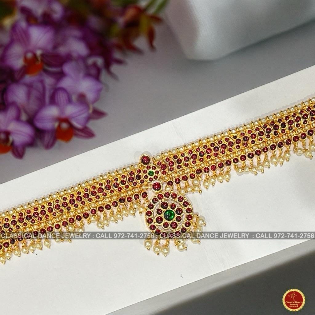 ❥ Gorgeous Temple Kemp Indian Jewelry with Kempu, Stones, Hip chain, Waist Belt, Oddiyanam Kamabandh for weddings, Bharatnatyam, and Kuchipudi Dance Performances.