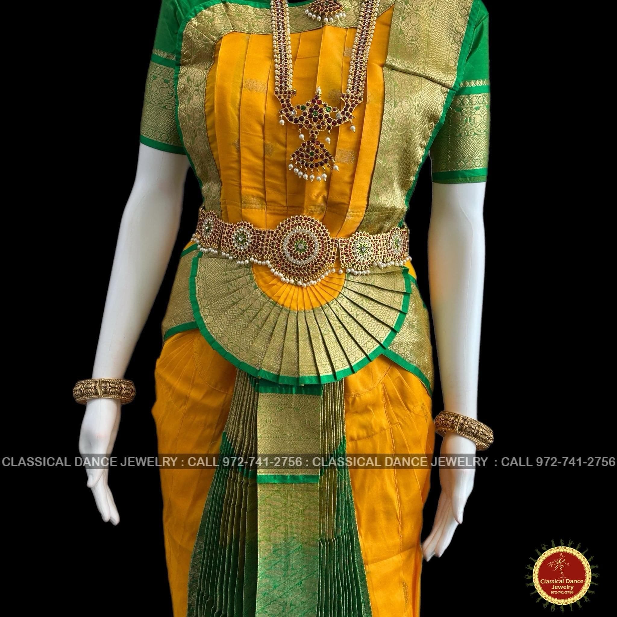 MANGO YELLOW GREEN 40 Inch Pant Length Bharatanatyam Dance Costume | Gold Zari | Art silk Dharmavaram Kanchi | Classical Dance Jewelry